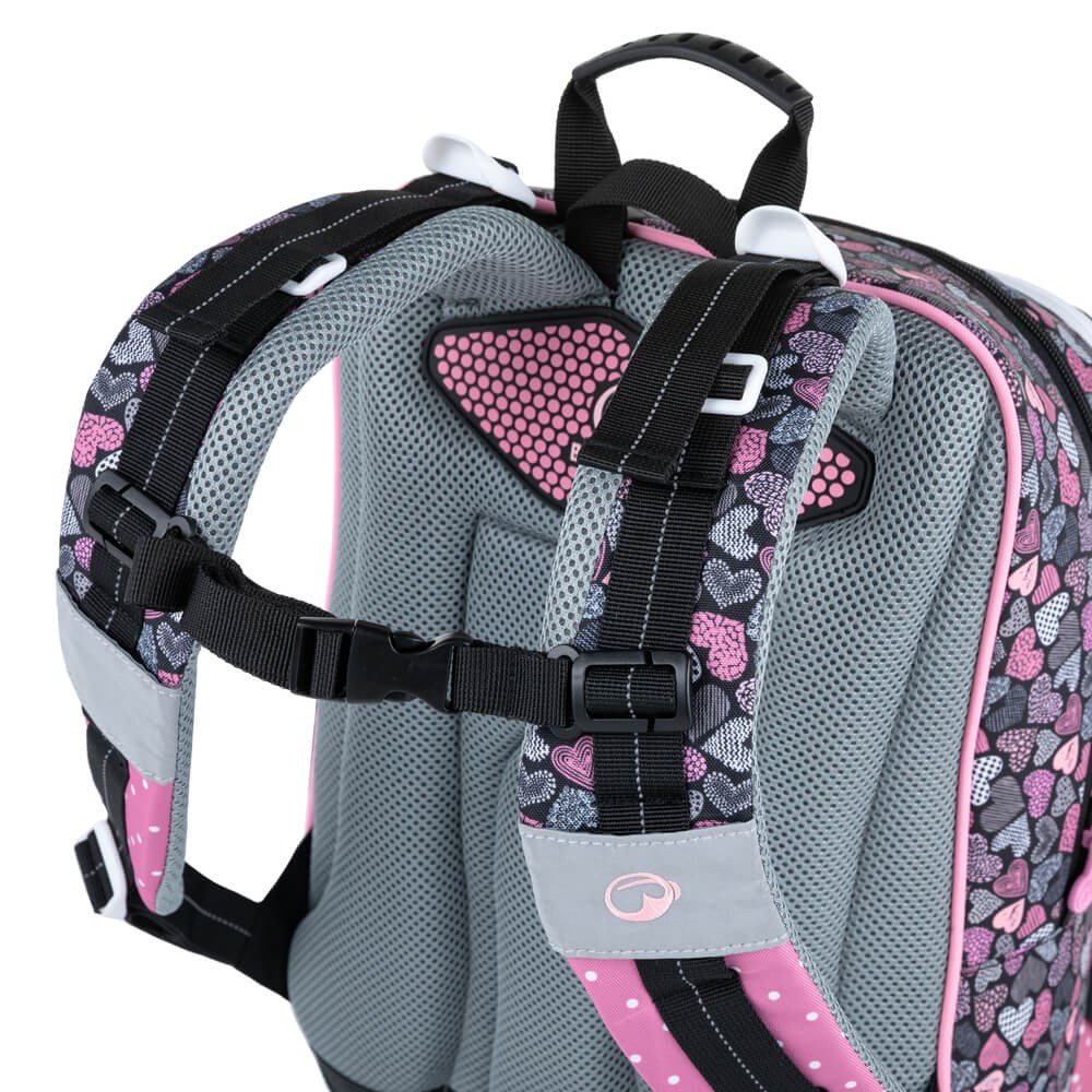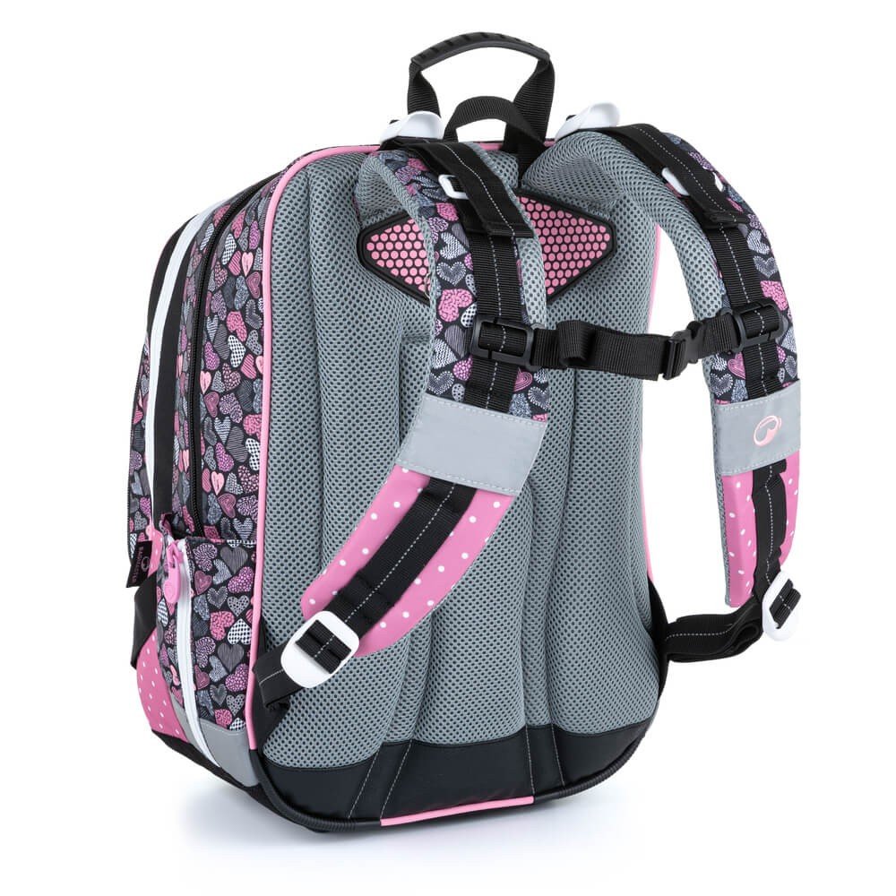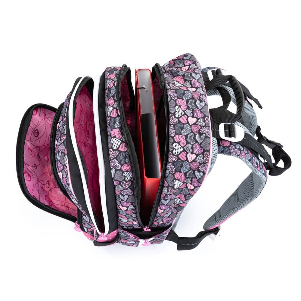 1.-3. třída ZŠ. Tříkomorový, prostorný holčičí školní batoh pro prvňáčky. Polstrovaný zádový systém batohu, se zdravotním posudkem, s vnitřním ergonomickým rámem. Polstrované ramenní popruhy včetně hrudního pásku, batoh s plastovými nožkami. Školní batoh v setu s penálem a sáčkem na přezůvky.