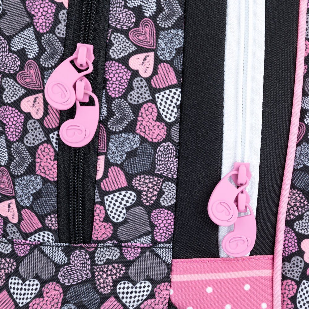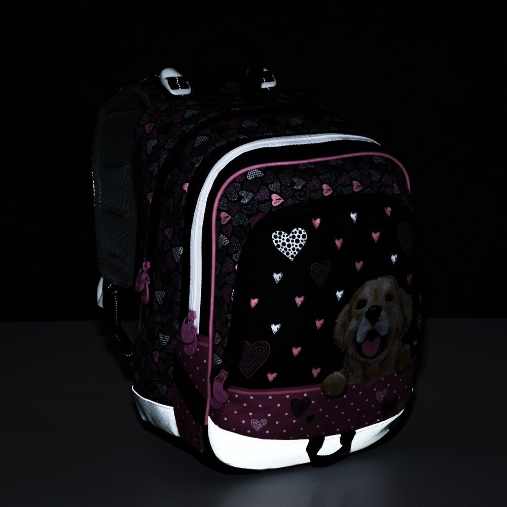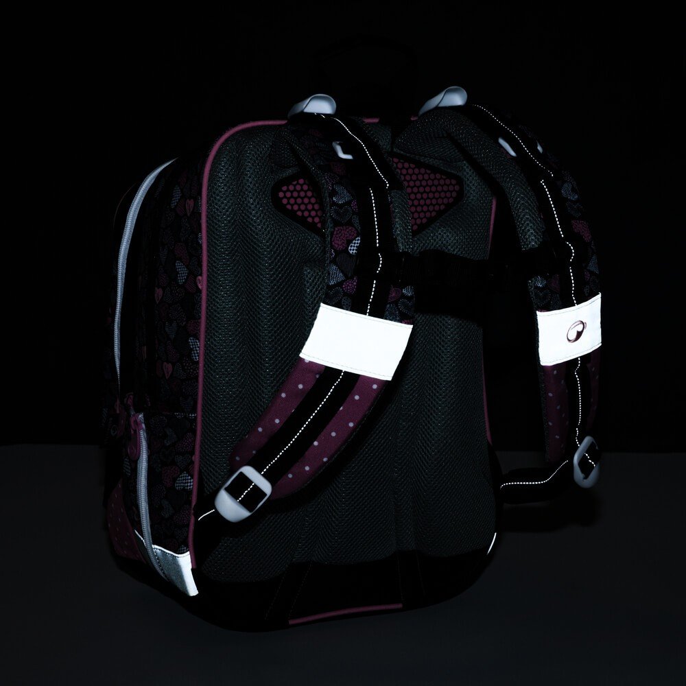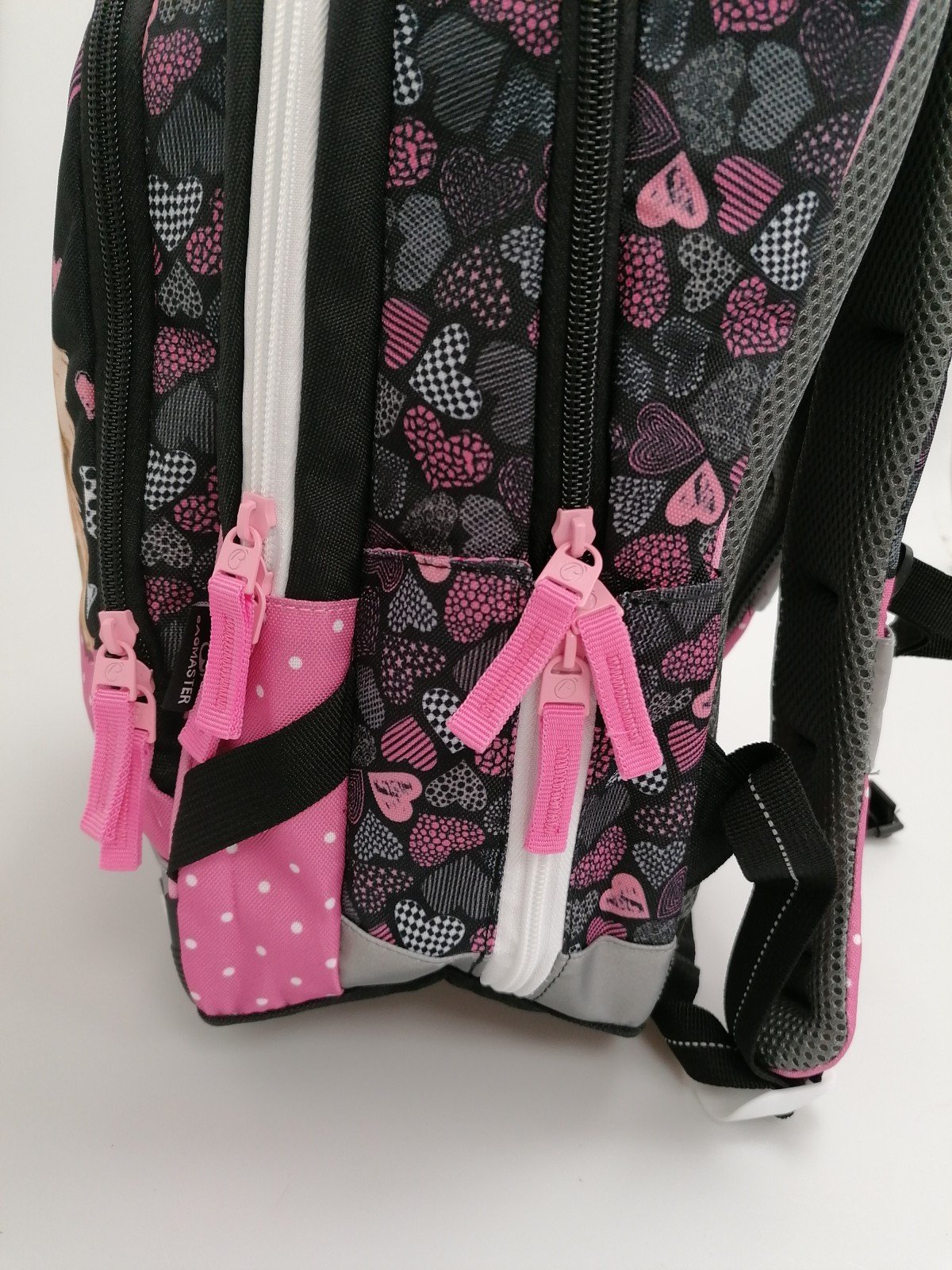 1.-3. třída ZŠ. Tříkomorový, prostorný holčičí školní batoh pro prvňáčky. Polstrovaný zádový systém batohu, se zdravotním posudkem, s vnitřním ergonomickým rámem. Polstrované ramenní popruhy včetně hrudního pásku, batoh s plastovými nožkami. Školní batoh v setu s penálem a sáčkem na přezůvky.
