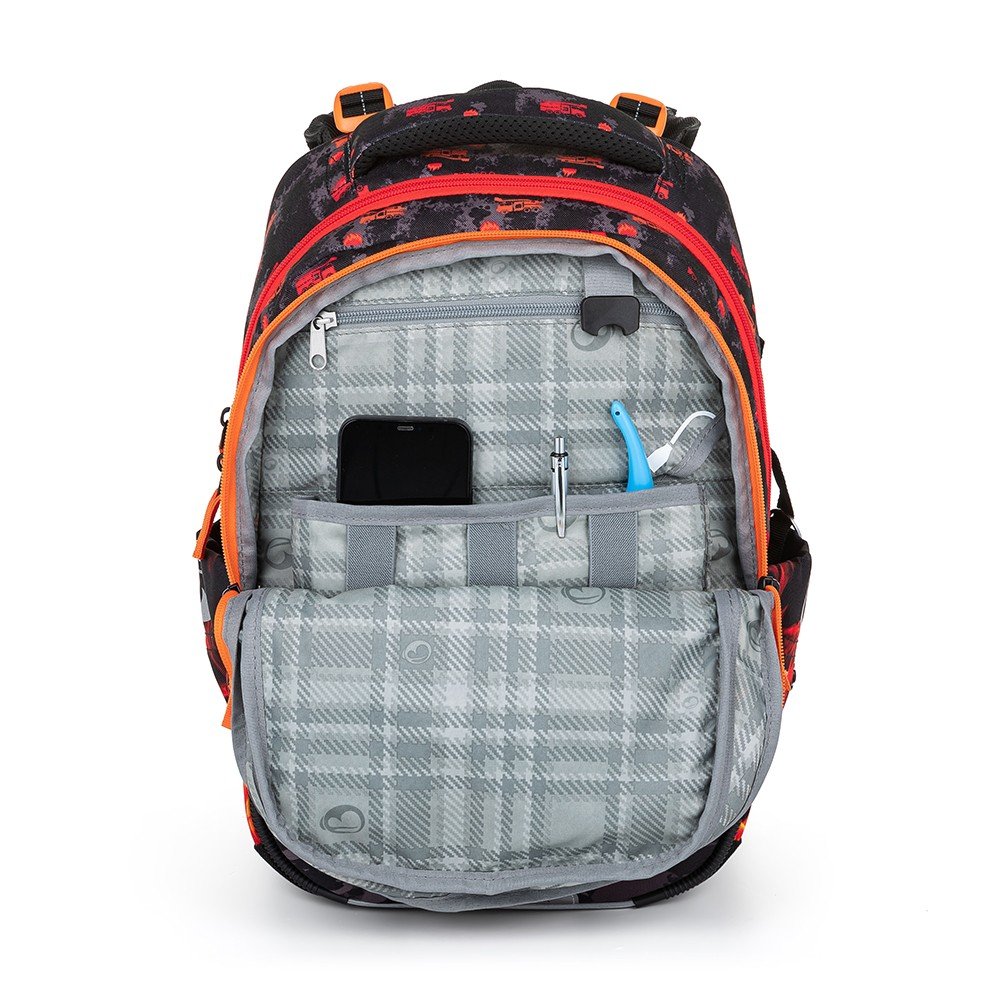 Poplááách! Hasiči jedou! Batoh pro všechny raubíře od 1. do 3. třídy, kteří si rádi hrají na hasiče. Má polstrovaná záda a ramenní popruhy, nastavitelný hrudní a vyjímatelný odlehčený bederní pás. Uvnitř je velmi prostorný. Mobil a peněženka najdou místo v praktickém organizéru v přední kapse. Samonavíjecí klíčenka na čip nebo klíče se dá připnout na boční poutko. Batoh váží necelý kilogram. Má plastové nožky, aby dobře stál nejen u lavice. A školák bude nepřehlédnutelný díky originálnímu motivu i díky reflexním prvkům.
