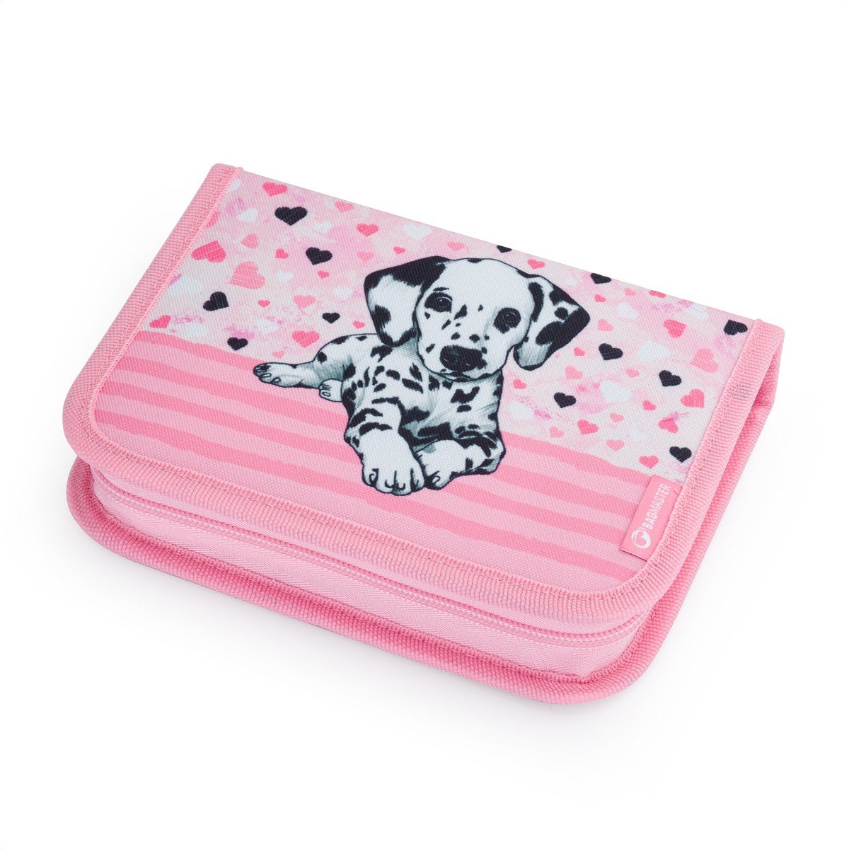 Penál s drobnými srdíčky a dalmatinem pro malé školačky na první stupeň. Gumové úchyty na dvou chlopních poskytují dostatek místa na všechny školní pomůcky. Školní pouzdro se uzavírá kvalitním zipem. Pouzdro s motivem dalmatina je lehké a v batohu nezabírá moc místa.