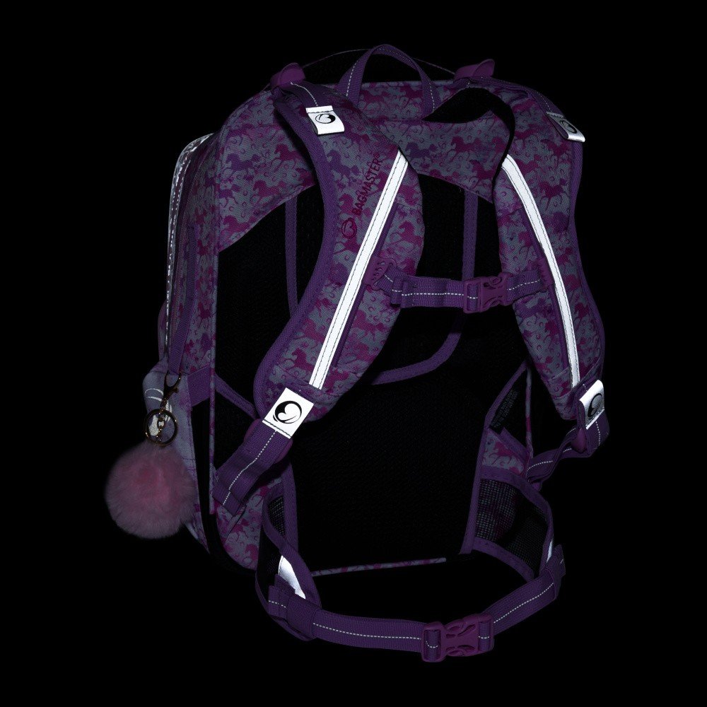 Jemný set s koníky pro malé školačky od 1. do 3. třídy. Batoh je extra lehký, přitom prostorný. Má dvě velké komory a dvě praktické přední kapsičky. Stojí na plastových nožkách, ve tmě svítí reflexní prvky. Zádový systém s nastavitelným hrudním pásem a odlehčeným vyjímatelným bederním pásem má zdravotní posudek. K batohu bude školačce ladit penál na psací potřeby a látkový vak na přezůvky nebo školní úbor.
