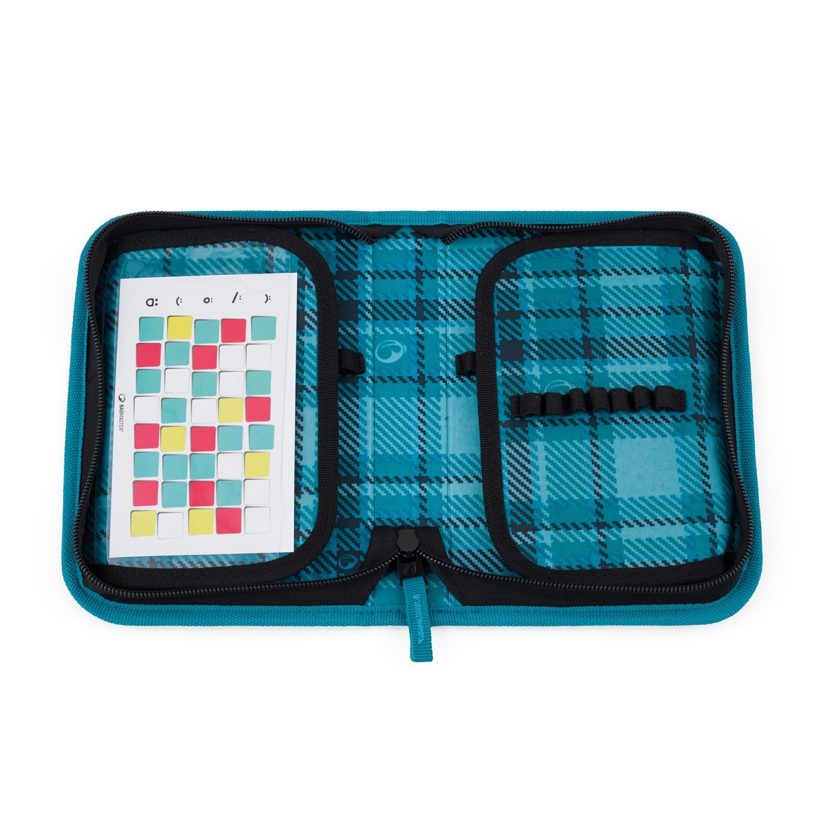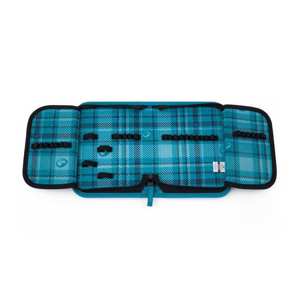 Modro-černé pouzdro pro malé školáky s kostičkovu říší. Uvnitř penálu jsou dvě přepážky s gumovými úchyty na psací potřeby a kapsami.