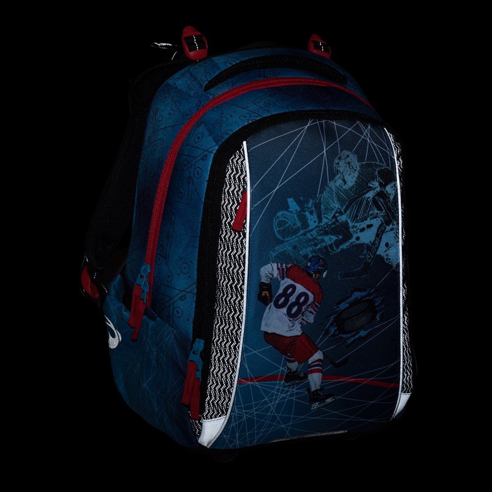 Vítězství na ledě, styl v srdci – batoh pro děti od 1. do 3. třídy, se kterým se školák bude cítit jako opravdový hrdina. Kromě krásného hokejového motivu má dostatek úložného prostoru. Má ergonomicky tvarovaný zádový systém a díky hrudnímu a bedernímu pásu nezatěžuje krční páteř. Součástí školního batohu s ledním hokejem jsou přední a boční reflexní prvky.