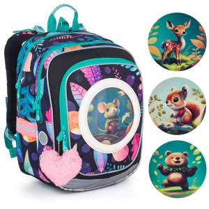 Model ENDY neváží ani kilogram, proto je ideální pro holčičky s výškou od 110 cm od první až třetí třídy ZŠ. Součástí batohu jsou čtyři obrázky s myškou, srnkou, medvědem a veverkou. Hravý design doplní plyšový přívěsek ve tvaru srdce.