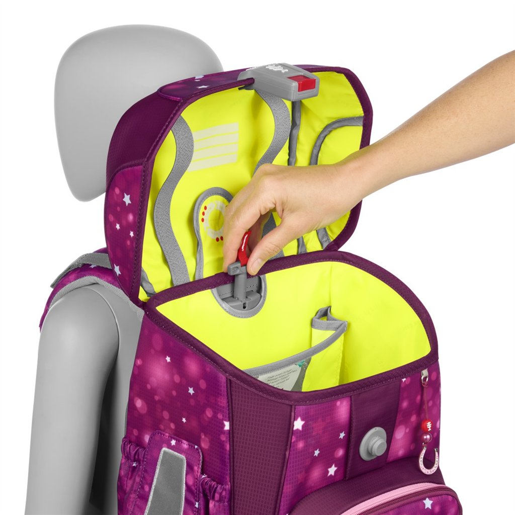 - možnost plynulého výškového nastavení ramenních popruhů pomocí otočného mechanismu uvnitř aktovky, zajišťuje přesné nastavení ramenních popruhů přímo na zádech dítěte