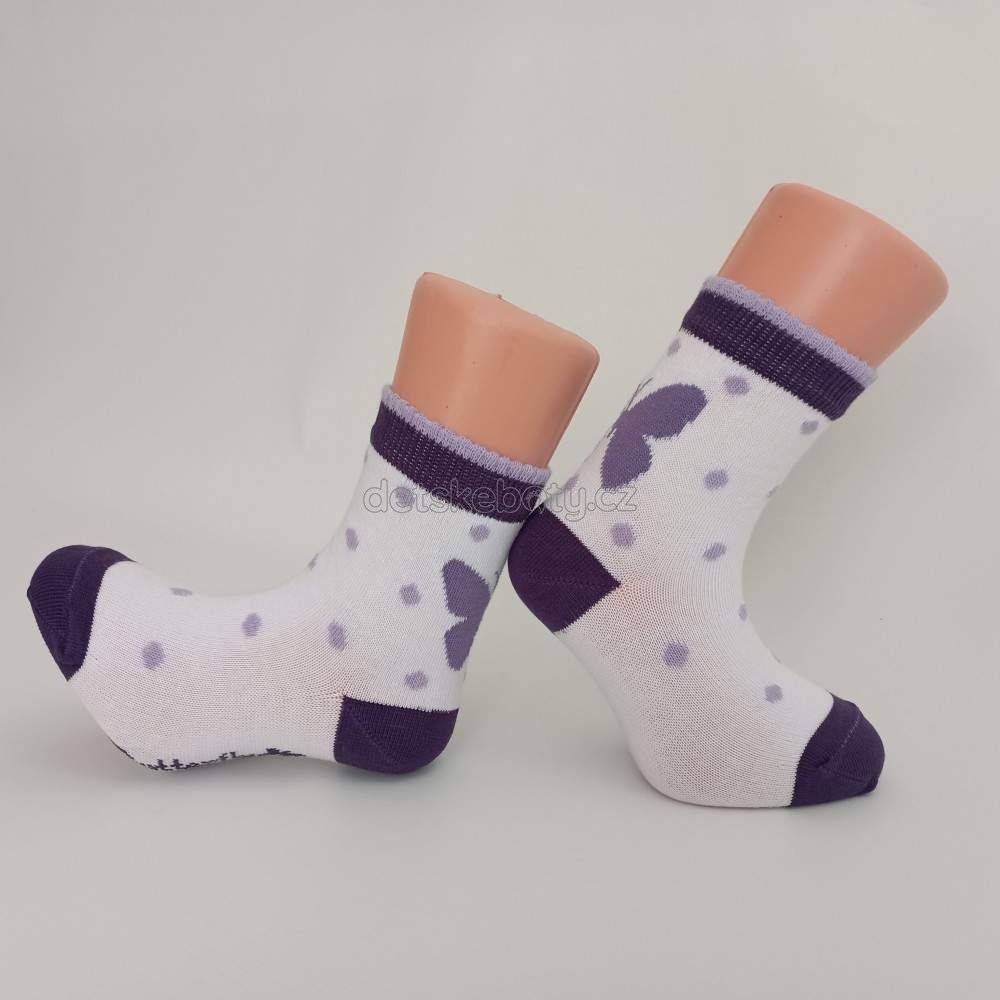Dívčí ponožky s motivem  motýlka nad patou.  Originalita, pohodlí, styl. Kousek s nápaditým vzorem  a barvami, který stojí za oživení dětského outfitu. Jsou vyrobeny z jemné bavlny a díky přidanému elastanu se skvěle přizpůsobí tvaru dětské nohy. Mají extra plochý šev v oblasti prstů a úzké komfortní lemy, které se nezařezávají. Špička a pata ponožek jsou zesílené.